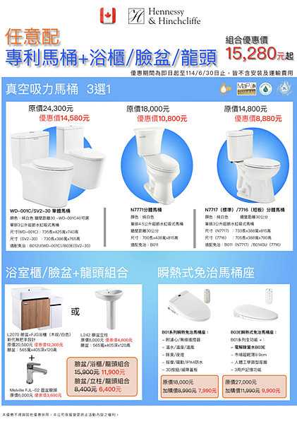等了好久,終於等到H&H馬桶臉盆衛浴的超值優惠組合啦!