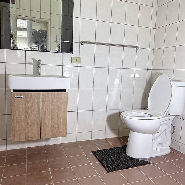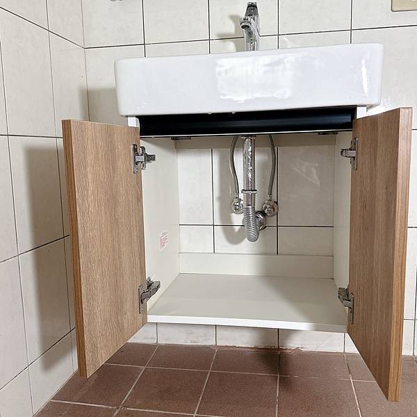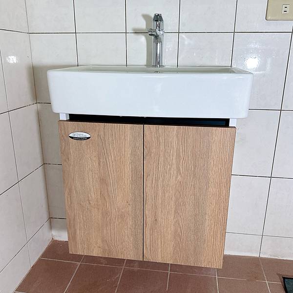 搭配家中磁磚,Stanma選了PVC材質防水木紋的浴櫃!