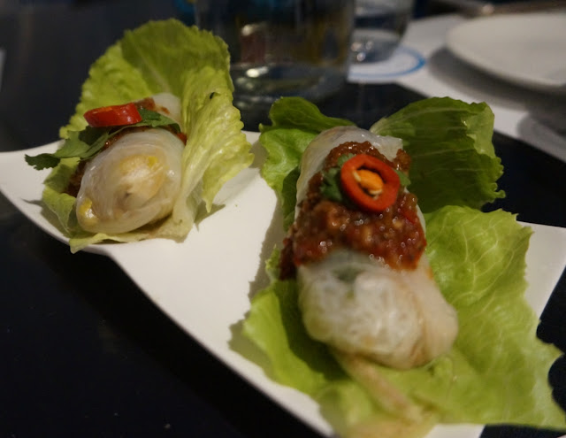 第四道:創意料理-越式芺蓉春捲佐獨家異國莎莎醬:主廚用越式餅皮搭配特殊配料,吃起來爽口不膩~屎蛋媽超推。