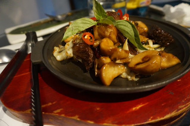 第六道:台式正宗北港麻油三杯綜合猴頭菇:滿滿的一盤猴頭菇加入北港麻油拌炒木耳、米血,份量十足,香氣也十足,屎蛋的胃口大開。