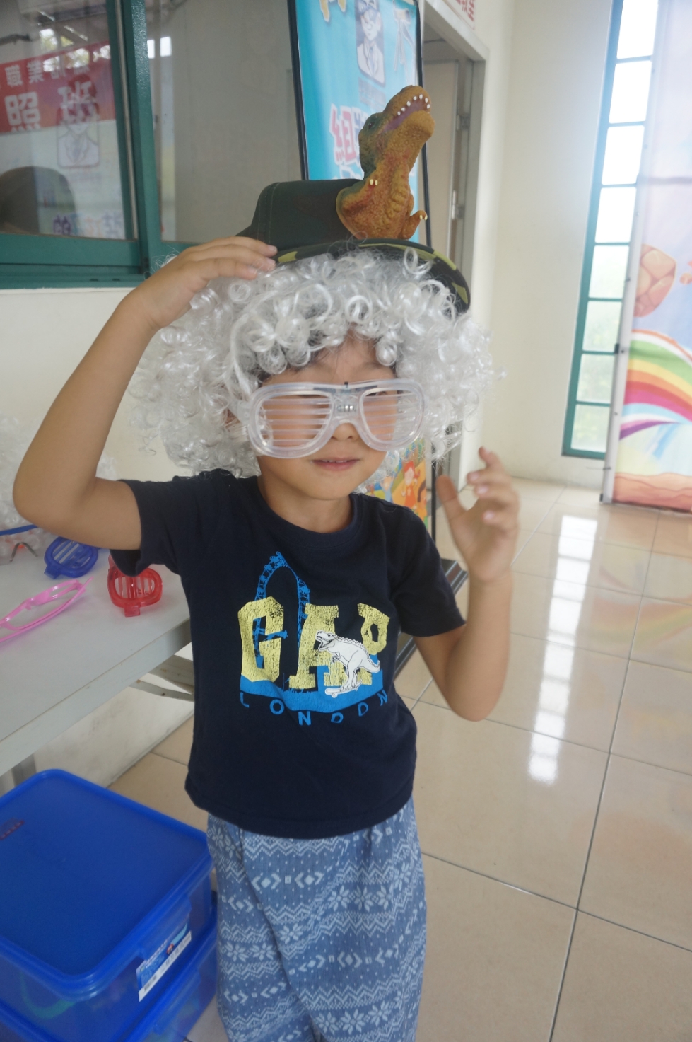 一到上課地點,門口準備好多搭配恐龍主題的變裝衣服,讓你一秒變恐龍,屎蛋正忙著變裝成愛因斯蛋,哈!