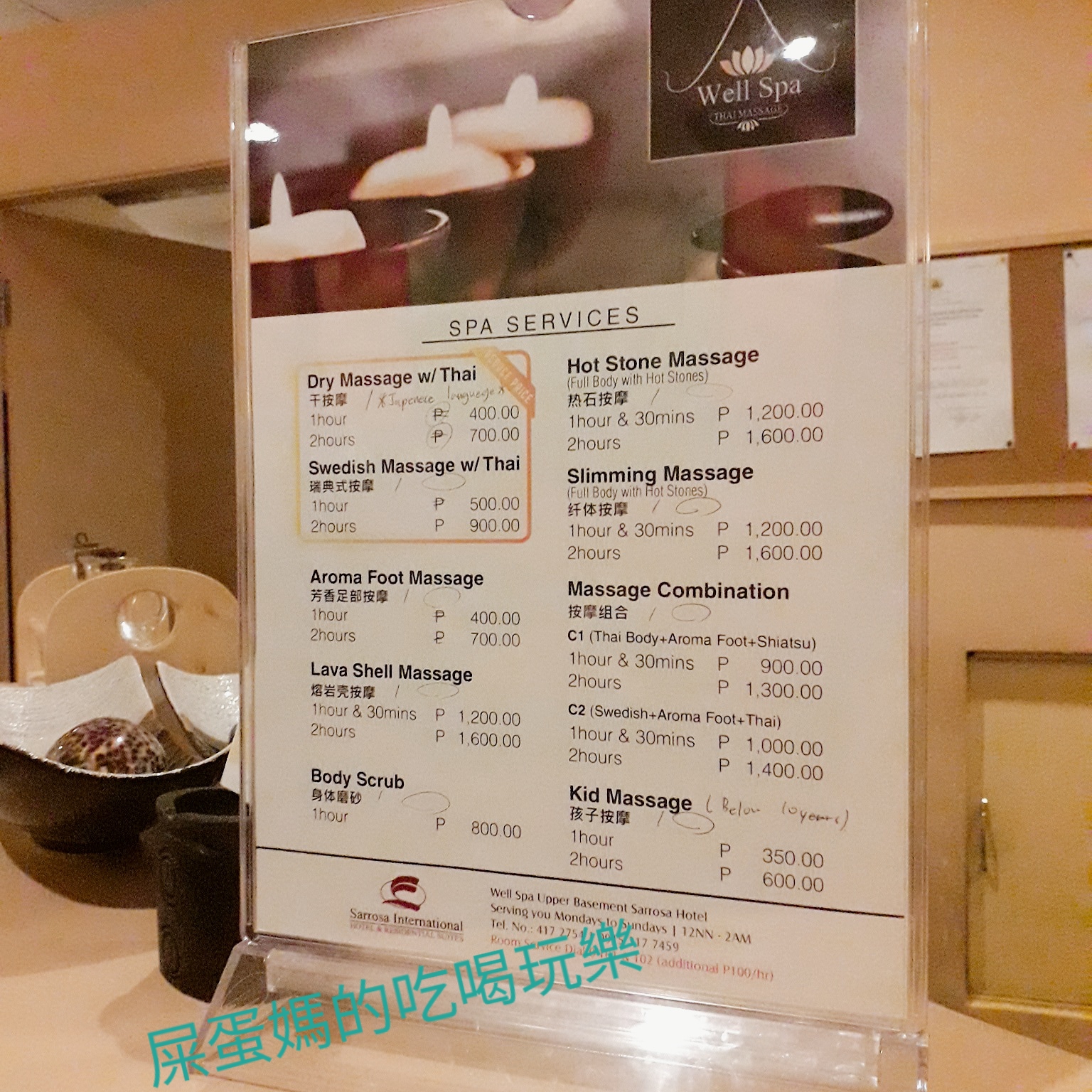 不要被位於Sarrosa International Hotel下方的Well SPA嚇到,價格一樣親民!若住在Sarrosa International Hotel還可天天下來按摩,超方便!TAKA HARI校區的學生證,還打9折,屎蛋媽真是選對學校了!!
