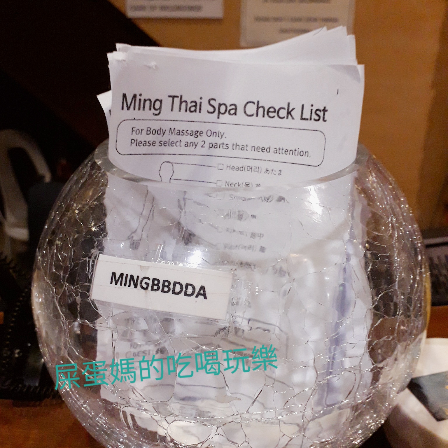 Ming Thai SPA 按摩結束後還會給你問卷表,供你勾選身體需要注意的部位(是身體要加強的部位嗎?)(這是不是按摩前就該填寫的問卷?是不是啊?是不是啊?)