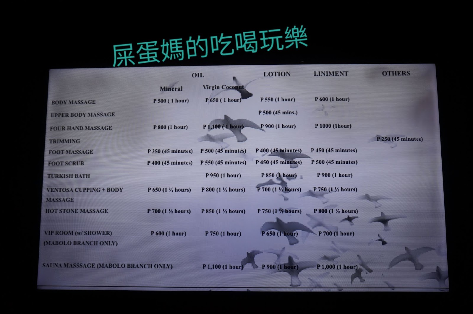 屎蛋媽做的是中藥草按摩90分鐘850元披索還打9折,大約460元台幣!俗啦(台語)!Ming Thai SPA還有天然火山石按摩...等各式各樣的特殊按摩!