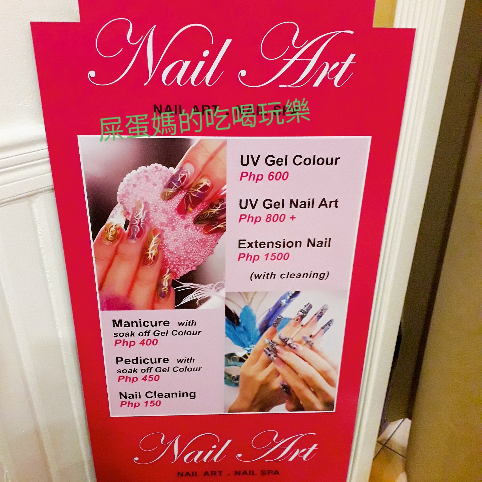 屎蛋媽覺得在指甲保養的部分,價格比台灣便宜,但凝膠指甲(光療)的部分,跟台灣差不多,屎蛋媽選了簡單的彩繪圖案加上保養,只要1000元披索有找,還打8折,整體還是很超值!