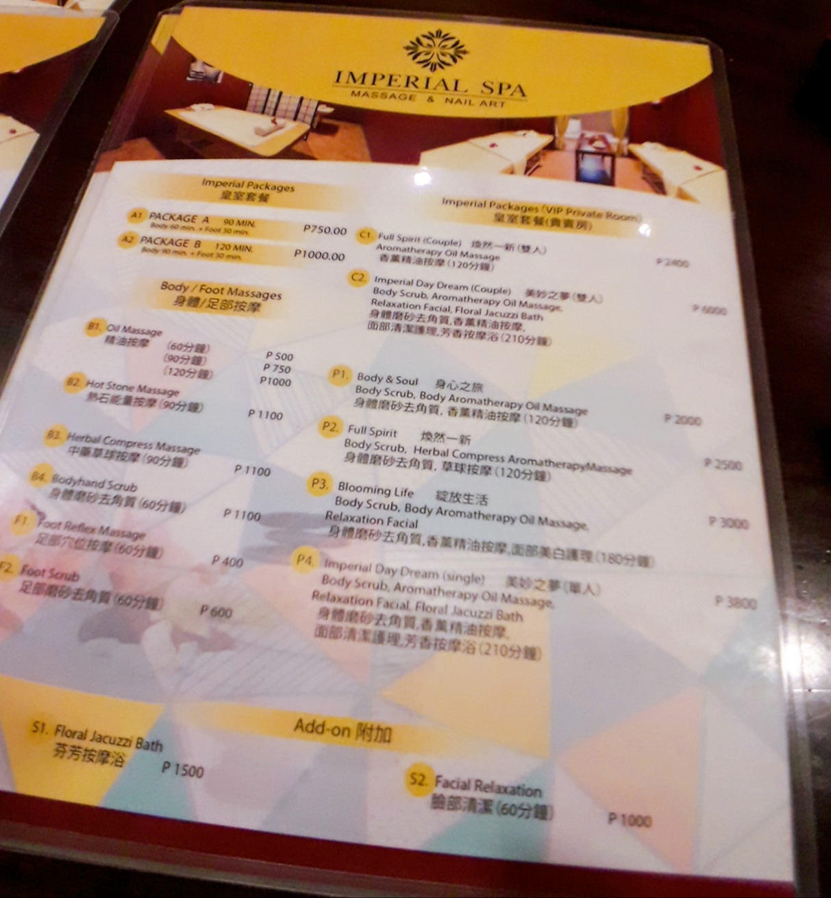 IMPERIAL SPA一般精油放鬆一個小時只要500元披索(台幣300元),使用TAKA HARI校區學生證8折後,只要400披索(台幣240元),且按摩後不另外收小費,是不是超便宜!