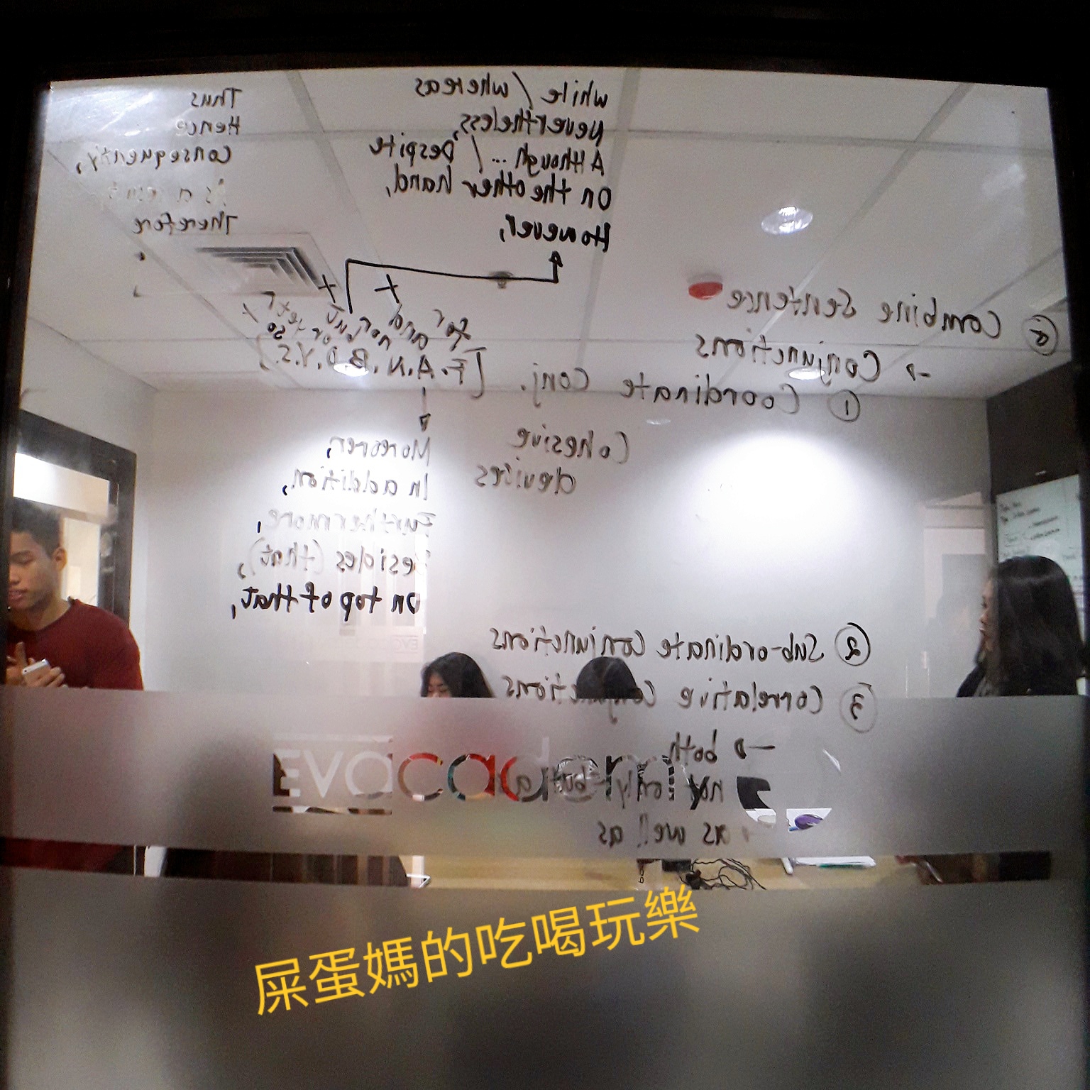 EV 校區雅思團體教室專區,學生們都很熱切在課堂上討論英文呢!牆上的英文,都是老師和學生們激盪出來的成果,屎蛋媽也好想參與呦!