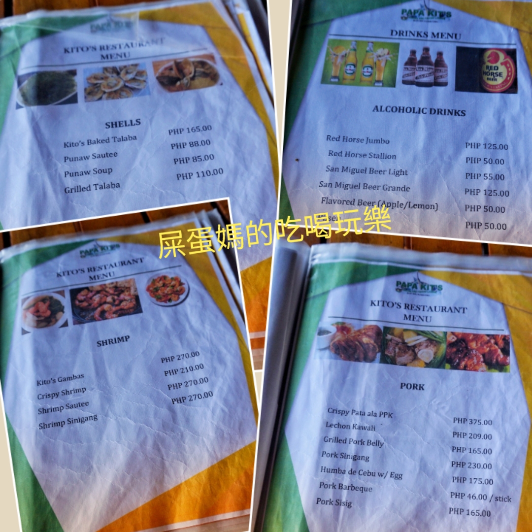 KITO'S RESTAURANT的菜單,大約在160~300披索間,飲料的部分,菲律賓的啤酒價格比果汁還要便宜呢!KITO'S RESTAURANT大多為海鮮的料理,愛吃海鮮的捧友一定會吃的超開心!