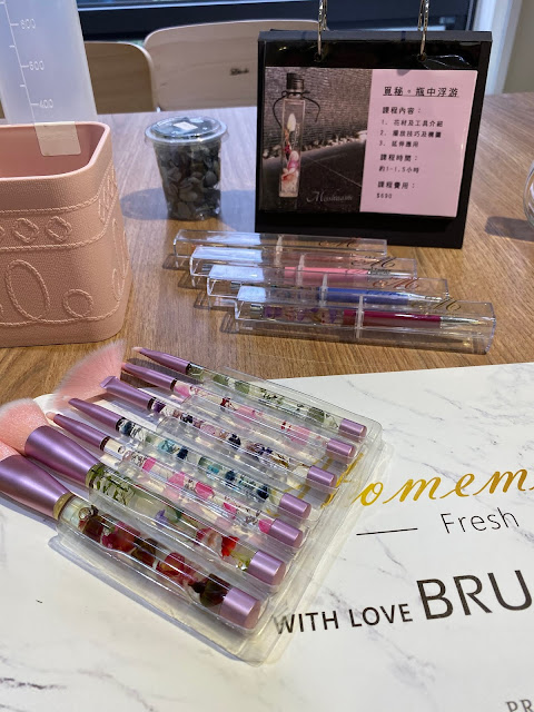 除了《覓秘。瓶中浮游》,還有許多浮遊花課程《花甜菓室。桌花甜點》、《永恆之愛。玫瑰花球鑰匙圈》、《凡爾賽花園。宮廷擴香石》、《50度C。浮游花筆》,每個作品都像一個擺飾品一樣精緻漂亮,但屎蛋這粗魯的小子,還是先做可塞入大朵花材的《覓秘。瓶中浮游》較為合適!