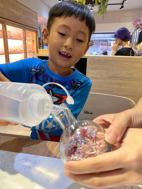 接著一樣是大人小孩都適合的《覓秘。瓶中浮游》浮游花DIY ,課程有很多瓶子可以選擇,屎蛋媽挑選了一個能傾斜放置的瓶子,屎蛋則由老師挑選瓶口大的瓶子(方面塞花)!老師不惜成本使用價格高昂的永生花做為課程材料,看到老師的成品浪漫又高雅!好期待啊!