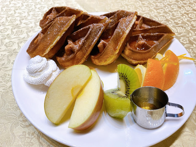 綜合水果鬆餅烘烤時間需要15分鐘,配料豐富水果多,淋上楓糖醬,口感酥脆好吃! 不枉費辛苦等的15分!(是有多久?)