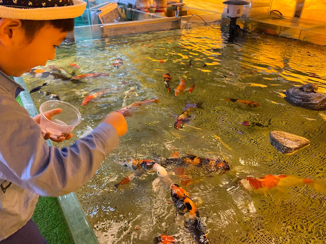 餵錦鯉一次50元,錦鯉池裡的錦鯉個頭都好大,還有烏龜混在其中搶食呢!