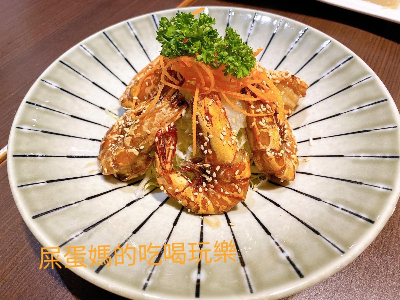 蜜汁大鮮蝦,炸的酥脆的大蝦,整支連殼都可食用!甜甜的醬汁搭配超級大蝦,口感十足,超滿足!