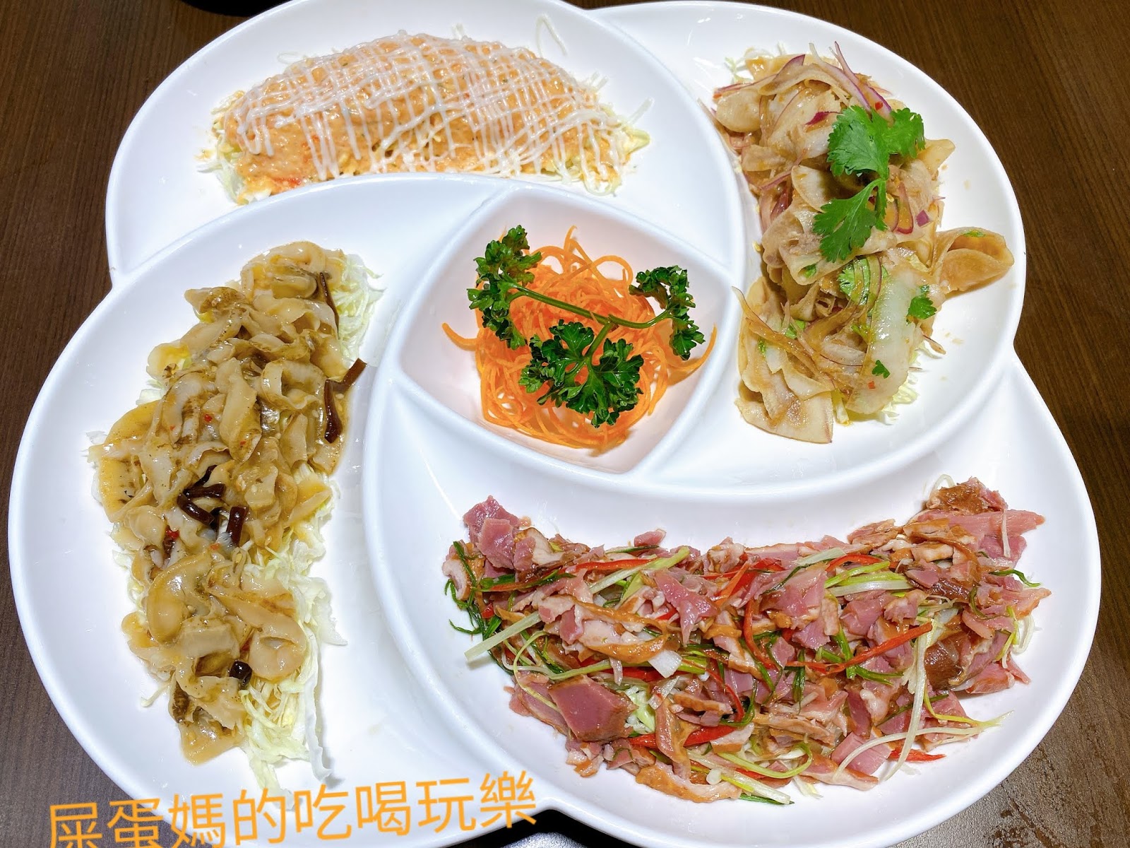 大四喜拼盤,有甘貝唇、龍蝦沙拉、涼拌鴨賞、雲南大薄片,豐富爽口的涼菜,是等待花雕雞鍋時的最佳解饞的配菜!