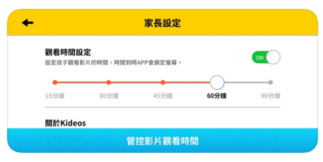 幸好Kideos APP有設定關看時間的功能,時間一到,就會温馨提醒!讓孩子的眼睛不至於因為長時間觀看螢幕而近視,讓屎蛋媽非常安心!
