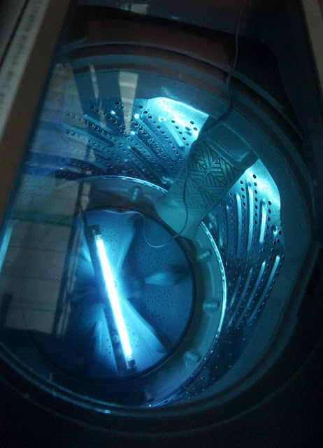 最後使用紫外線燈消毒殺菌,洗衣機瞬間變成紫外線消毒鍋了,非食用的衣服也受到這麼高規格的對待,衣服壽命也會延長吧!(延長屎蛋媽怎麼買新衣?)