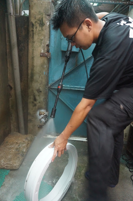 台南晶洗清潔中心小莊,用超強力的噴槍,時常調整水柱的大小,來進行清潔!