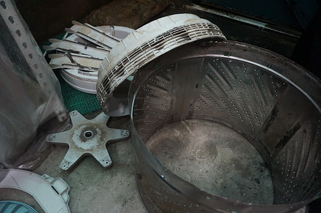 台南晶洗清潔中心小莊迅速的拆解下來洗衣機備件和零件,髒啊!(誰家的洗衣機?嗤之以鼻)